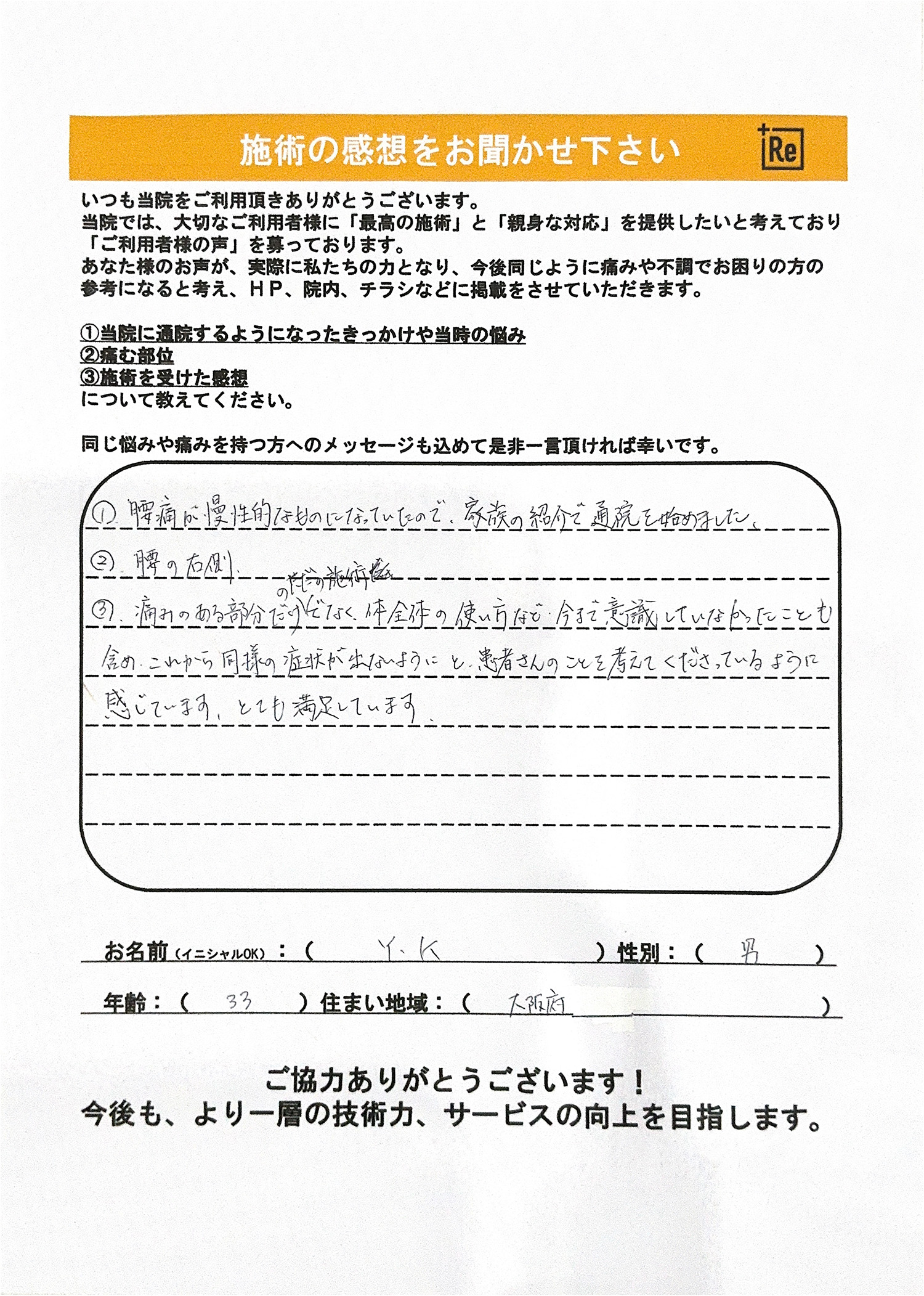 ③痛みのある部分だけのただの施術ではなく、体全体の使い方など今まで意識していなかったことも 含め、これから同様の症状がでないようにと患者さんのことを考えてくださっているように感じています。