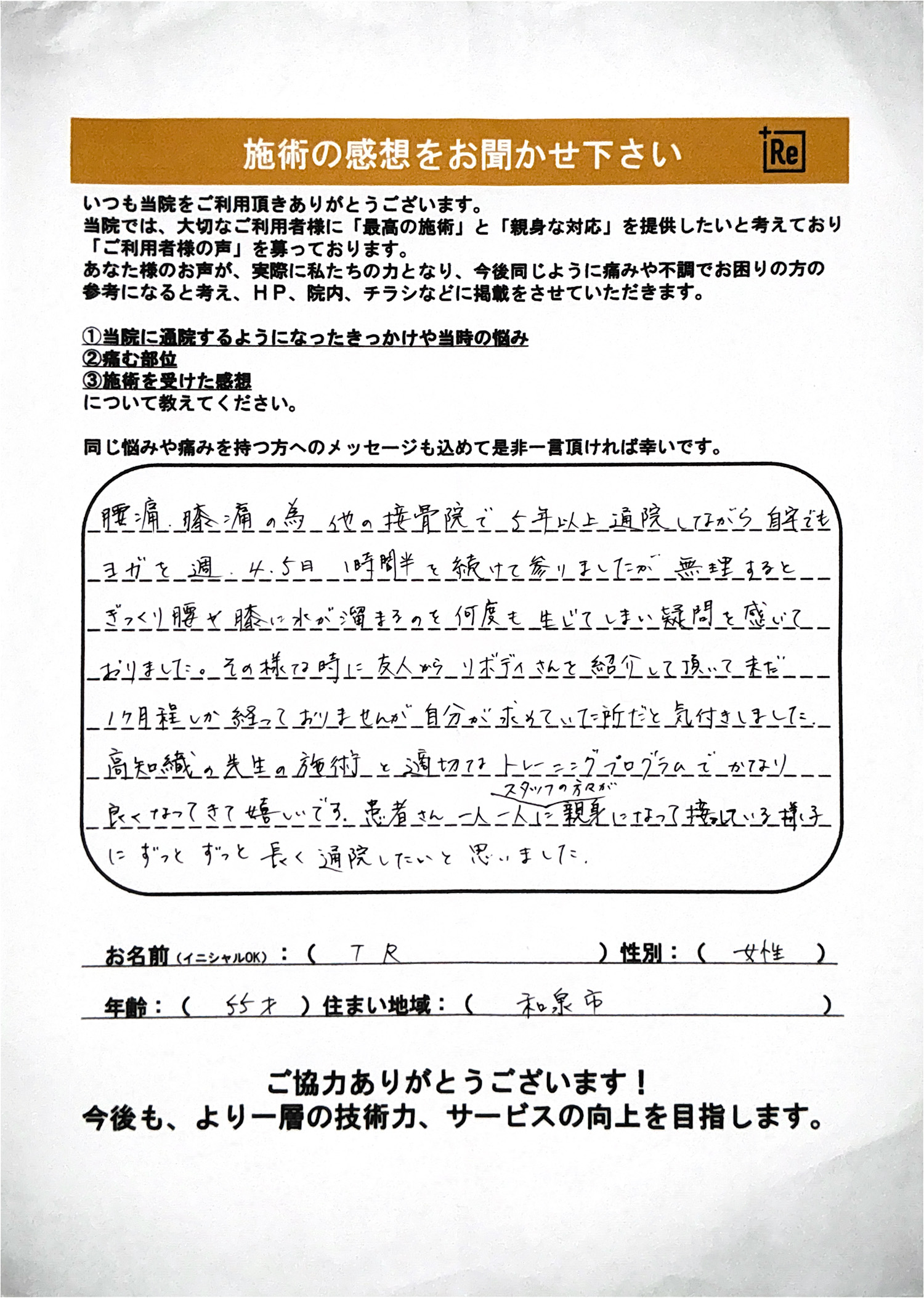 高知識の先生の施術と適切なトレーニングプログラムでかなり良くなってきて嬉しいです。