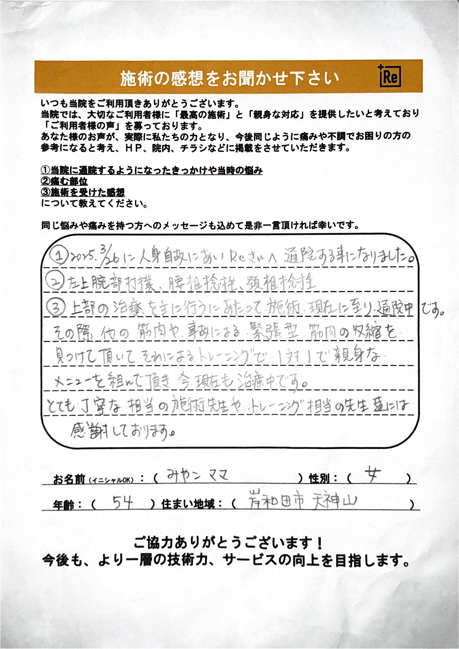 後、とてもみなさん親切で、しゃべりやすく自分的には相談しやすかったです。 痛みとかがでてもあきらめず施術を受けることが私は大事だと思ったので、あきらめずに受けてほしいです。